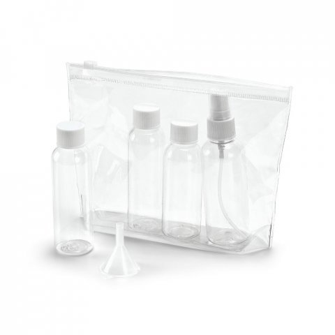 Vzduchotěsná toaletní taška. PVC. Obsahuje 3 nádobky (2 x 65 ml a 60 ml), 1 odpařovač (80 ml) a 1 nálevku. Vhodné pro přenášení v kabině letadla. Vzduchotěsná toaletní taška. PVC. Obsahuje 3 nádobky (2 x 65 ml a 60 ml), 1 odpařovač (80 ml) a 1 nálevku. Vhodné pro přenášení v kabině letadla. 190 x 155 x 40 mm. Důvěřujte Muybuenaidea, vedoucímu merchandisingu již 15 let, a překvapte své zákazníky a zaměstnance jakýmkoli propagačním dárkem obsaženým v naší široké nabídce produktů.
