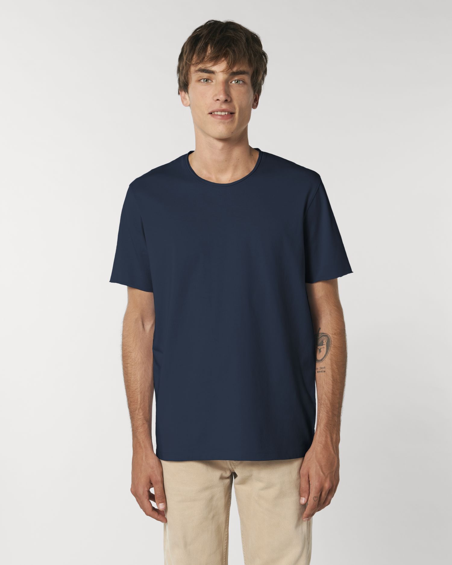 Unisex tričko se syrovým okrajem. Regular fit, kulatý výstřih, krátký rukáv, žerzejový úplet. Vypasovaný rukáv Jednoduchý steh na krku neopracovaný okraj Řetízkový steh na rukávech neopracovaný okraj Úzký dvojitý steh na lemu Oděv vypraný