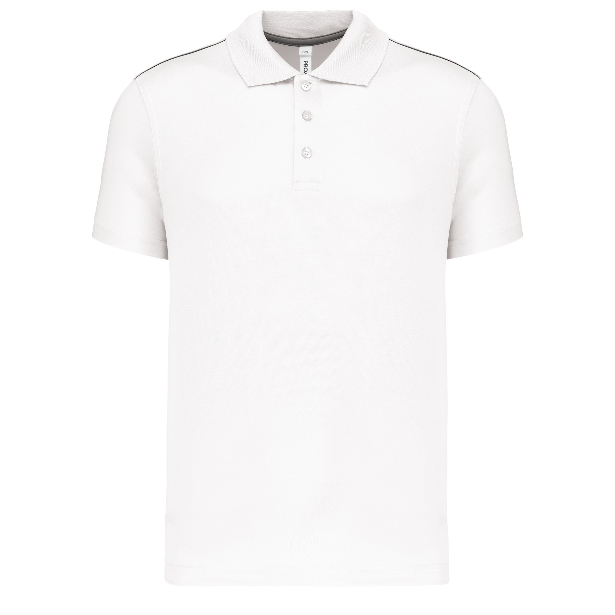 100% interlockový polyester. Rychleschnoucí tkanina. Žebrovaný límec. Zapínání na tři knoflíky. Kontrastní páska na krku a na bočních otvorech. Kontrastní lem na ramenou. Zakončeno dvojitým prošíváním ve spodní části rukávů a oděvu. Certifikát STANDARD 100 od OEKO-TEX® č. CQ1007/7, IFTH. 100% Interlock Polyester: ultra odolný, lehký a prodyšný. Rychleschnoucí tkanina. Kontrastní čisticí proužek na krku a na bočních otvorech.