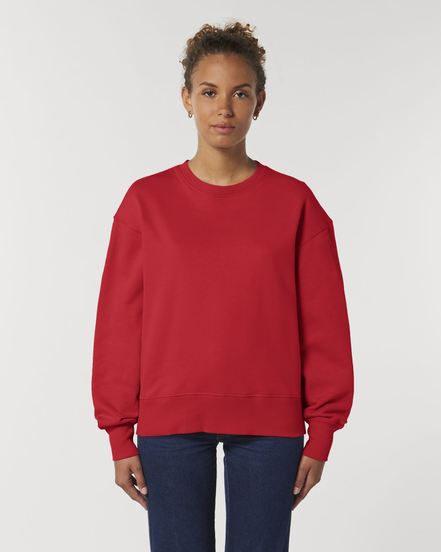 Volná unixexová mikina s kulatým výstřihem. Volný střih, kulatý výstřih, dlouhý rukáv, kartáčovaný fleece. Uzavřené rukávy 2x2 žebrování na krku, manžetách a spodním lemu Rybí kostice na zádech na krku Vnitřní půlměsíc v hlavní tkanině Jednoduchý steh na krku Dvojitý steh na průramcích, manžetách a lemu