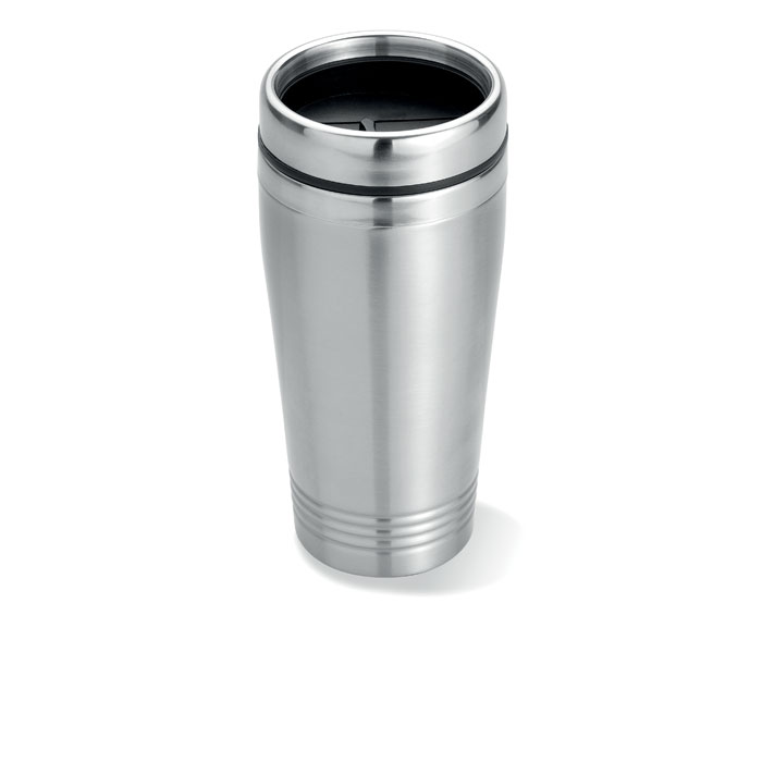 Cestovní hrnek z nerezové oceli s dvojitou stěnou, s černým víčkem PP. 400 ml.
