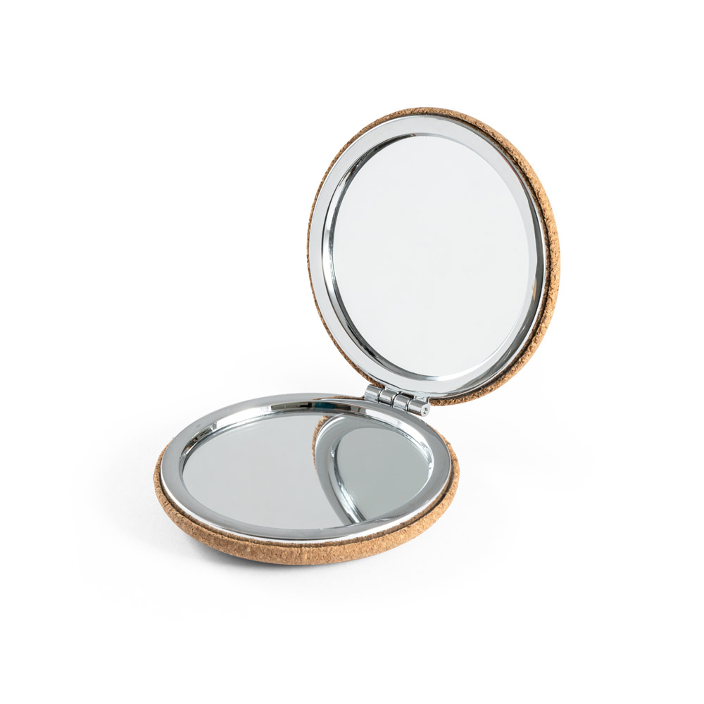 Dvojité korkové zrcadlo s magnetickým zavíráním. Dodáváno v přírodním papírovém pouzdře. ø 73 x 20 mm