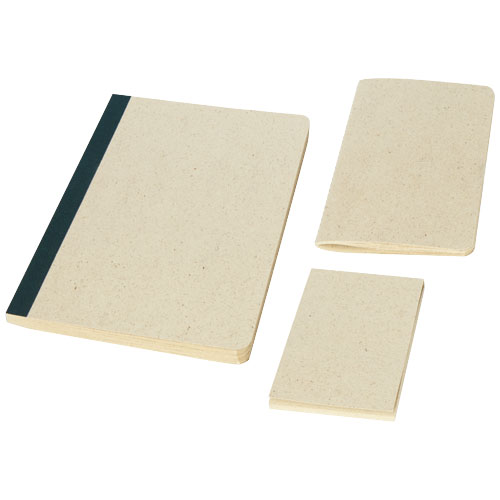 Kancelářská dárková sada obsahující poznámkový blok velikosti A5 se 64 listy a měkkými deskami, malý sešit sešitu (10 × 15 cm) a poznámkový bloček (8 × 11,5 cm). Všechny 3 položky jsou vyrobeny z travního papíru o gramáži 90 g/m2, který obsahuje až 40% travních vláken a má malý dopad na životní prostředí. Při jeho výrobě se ve srovnání s běžným papírem spotřebovává méně vody a energie a nepoužívají se žádné chemikálie. Všechny položky se vyrábějí v Evropě, což přispívá k nižší uhlíkové stopě.