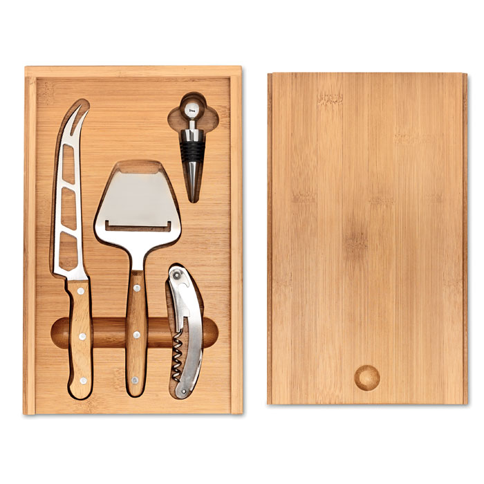 Bambusová sada na sýry a víno. Obsahuje ocelový nůž, škrabky na sýr, otvírák z nerezu a zátku na víno. Baleno v bambusové krabičce.